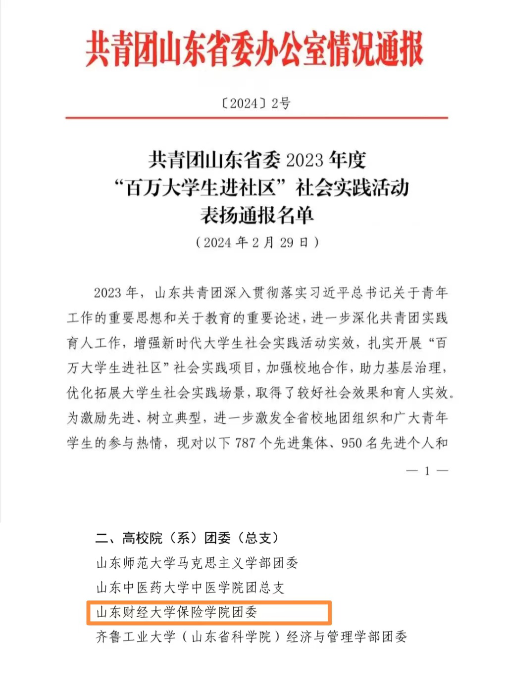 近日,共青团山东省委发布《2023年度“百万大学生进社区”社会实践活动表扬通报名单》,学院团委荣获“先进集体”称号,这是自“百万大学生进社区”活动开展以来我院首次获此殊荣,社会实践工作再创佳绩!