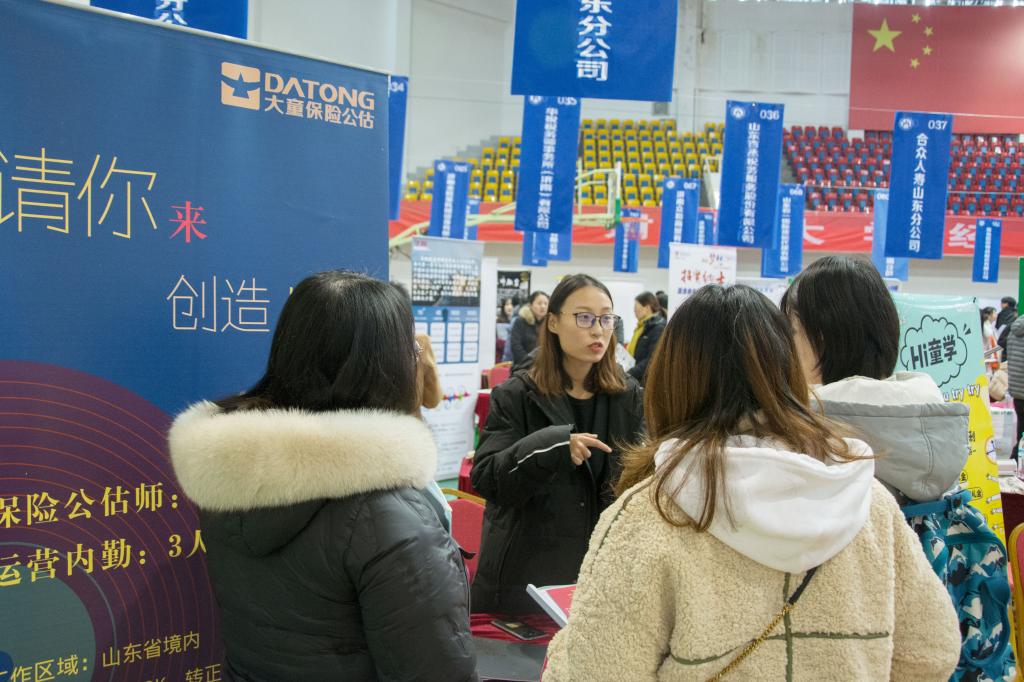下午,大童保险销售服务有限公司山东分公司等多家企业在学校进行了现场面试,在严肃而不失活泼的气氛中帮助同学们进一步加深了对岗位的了解,为本次招聘会画上了圆满的句号。