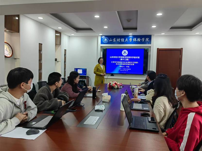 11月10日下午,太阳成集团122ccvip青年学者讲堂第十三期在办公楼1108会议室顺利举行,学院付红副教授担任主讲人,保险投资系主任范红丽副教授主持,青年教师和研究生积极参与,线上线下参与人数近100人。