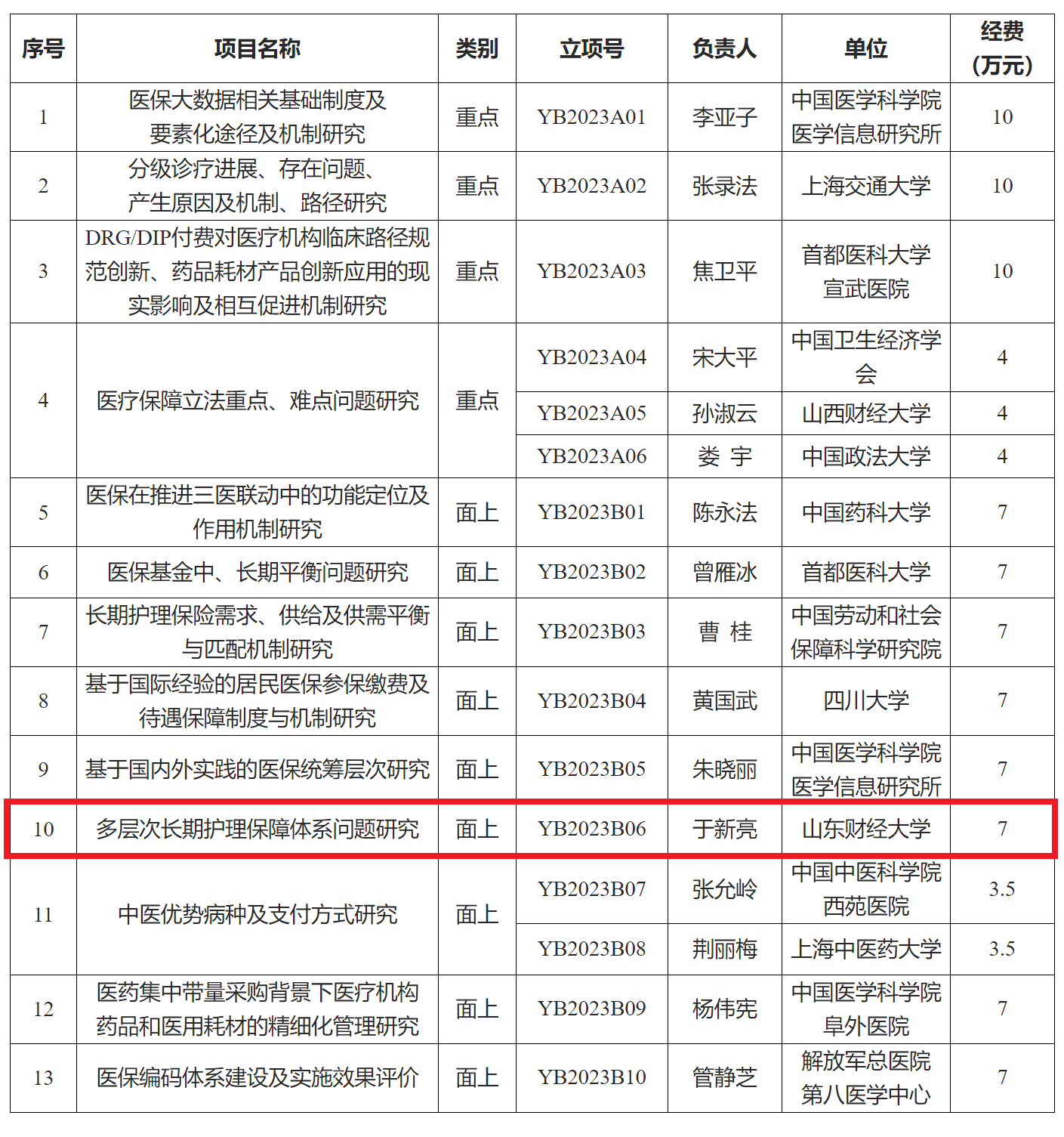 经过形式审核、技术评审、院务会审定等环节,首都医科大学国家医疗保障研究院于近日公布2023年度开放性课题立项名单,共资助4个重点课题、9个面上课题,我院于新亮教授及其团队申报项目“多层次长期护理保障体系问题研究”获得面上课题立项。