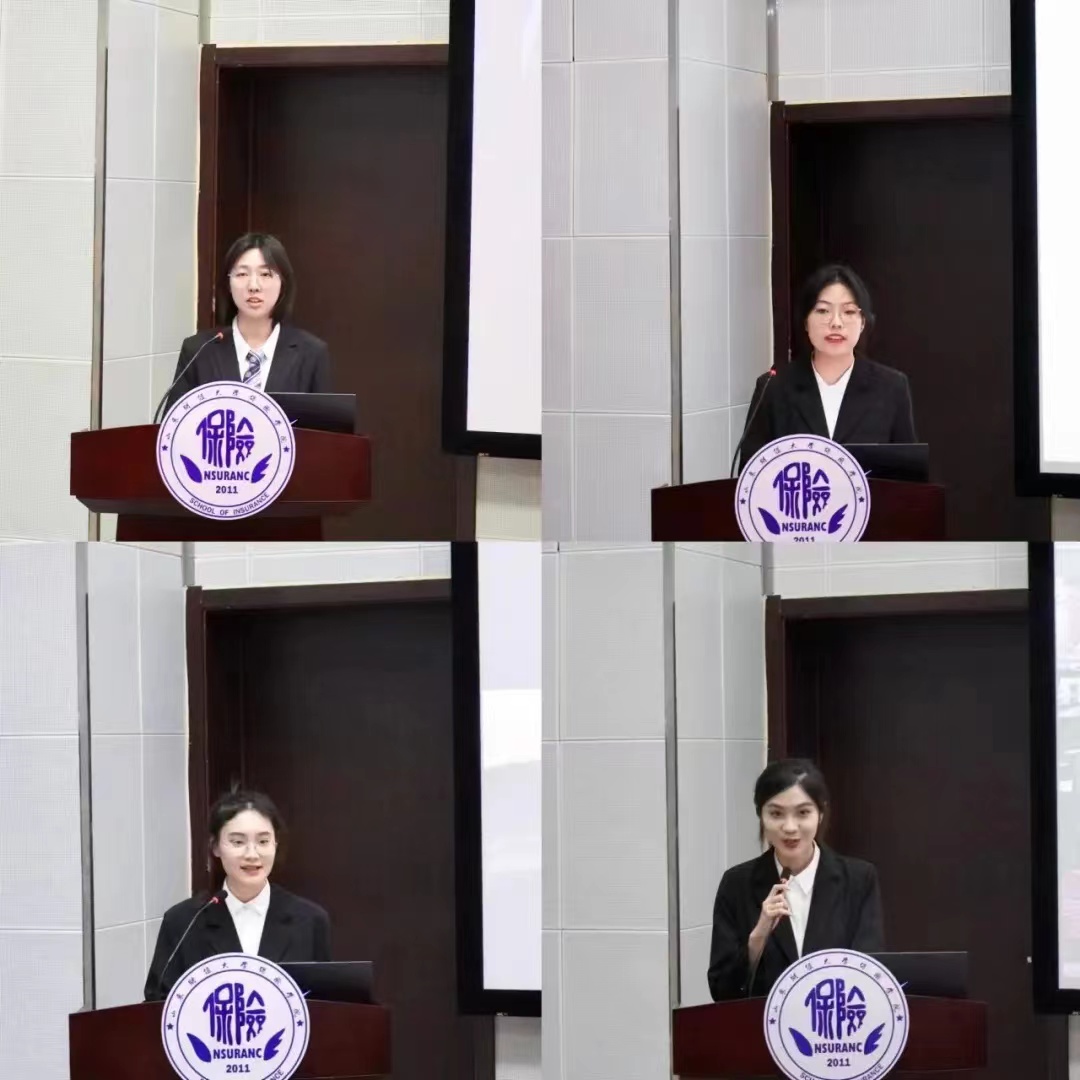 决赛答辩顺序由抽签决定,每组团队上台通过PPT的形式就产品的设计理念、可行性分析、保险责任、理赔方案、费率厘定以及前景展望等方面对作品进行展示汇报,评委针对问题进行问答。在展示环节中,各团队准备充分,不仅为评委老师提供纸质产品介绍以全面展示团队作品,还能在有限的时间里着重展示出团队产品的亮点,对于评委老师的提问也能够沉着冷静地回答,整个答辩环节精彩而又激烈,评委老师对各团队的保险产品提出了专业性的指导意见,使得各团队对自身产品的设计有了更加全面的思考。