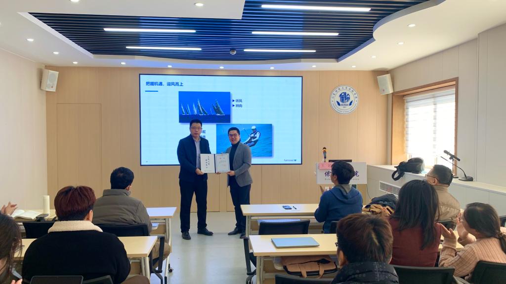 最后,于文广为王岩博士颁发硕士研究生合作导师聘书,并对王岩的交流分享表示感谢。王岩博士的讲解有助于我院教师和学生从国际视野了解再保险理论,从实践层面了解再保险业务,能够提升我院产学研协同发展水平。