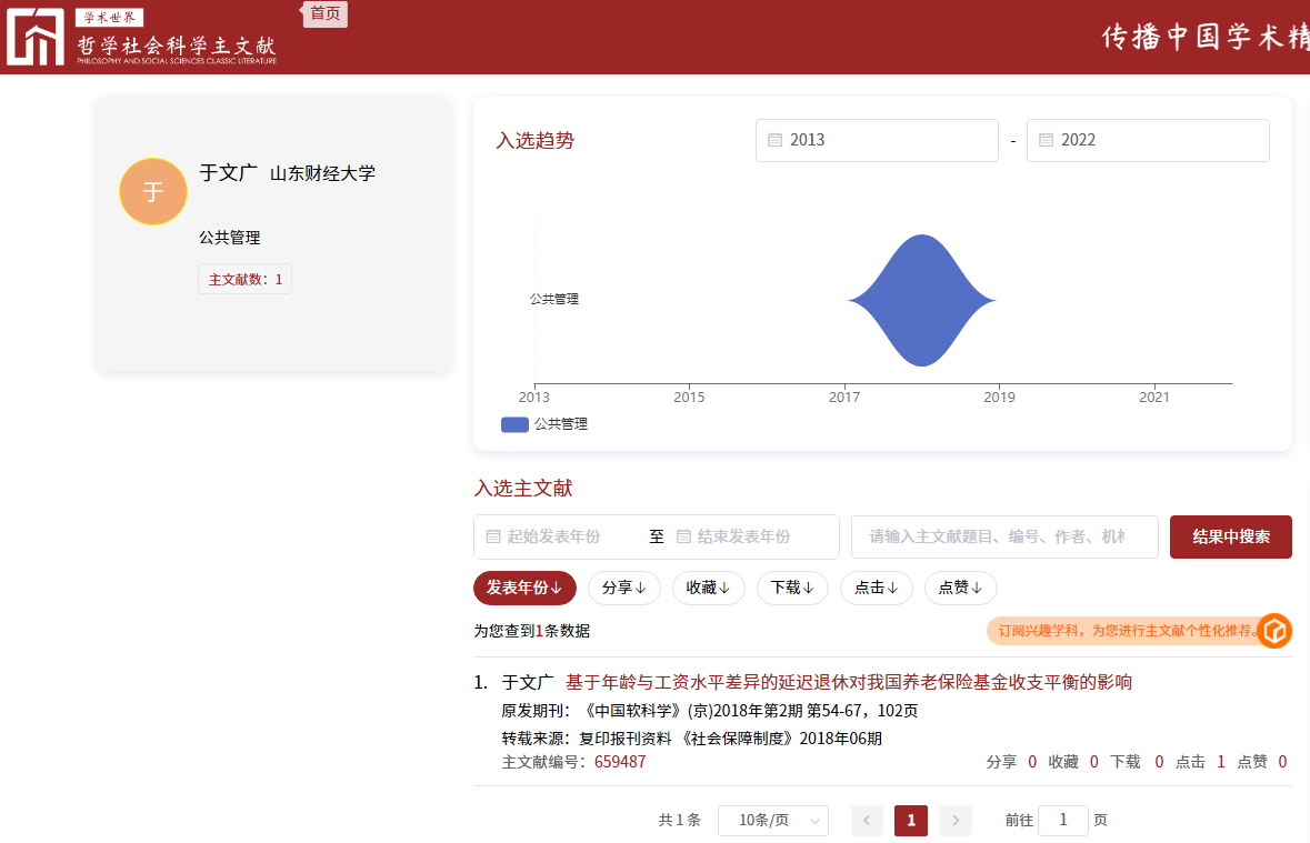 近日,收到中国人民大学书报资料中心通知,由中国人民大学建设的中国哲学社会科学自主知识体系数字创新平台之“主文献体系”平台发布了2013-2022入选论文,共有20621篇论文收录为主文献,涉及25个一级学科,107个二级科学,作者15454人,期刊1302种,其中tyc122cc太阳成集团27名教师的40篇论文入选主文献,涉及理论经济学、应用经济学、公共管理、工商管理、教育学、农村经济管理6个一级学科。我院于文广教授榜上有名,其2018年在《中国软科学》上发表的封面论文《基于年龄与工资水平差异的延迟退休对我国养老保险基金收支平衡的影响》成功入选,成为公共管理学科520篇主文献之一。