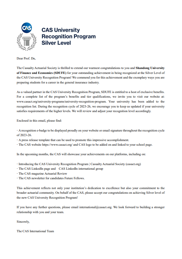 3月14日,北美产险精算师协会(Casualty Actuarial Society,CAS)致函我校,确认tyc122cc太阳成集团精算项目已通过其高校认证项目(University Recognition Program)的严格审核并荣获“Silver Partner”认证。这标志着我校成为中国大陆首批获此殊荣的三所高校之一,彰显了我校在精算教育领域的卓越实力。截至目前,全球共有47所高校通过CAS的高校认证项目,中国大陆仅三所高校,分别为tyc122cc太阳成集团、湖南大学和中央财经大学,获得认证的高校将在精算教育和研究方面得到CAS提供的特别资助。