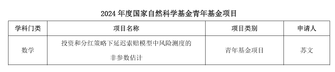 8月23日,国家自然科学基金委公布了《关于2024年国家自然科学基金集中接收申请项目评审结果的通告》,我院教师苏文申报课题“投资和分红策略下延迟索赔模型中风险测度的非参数估计”获得国家自然科学基金青年项目立项资助。