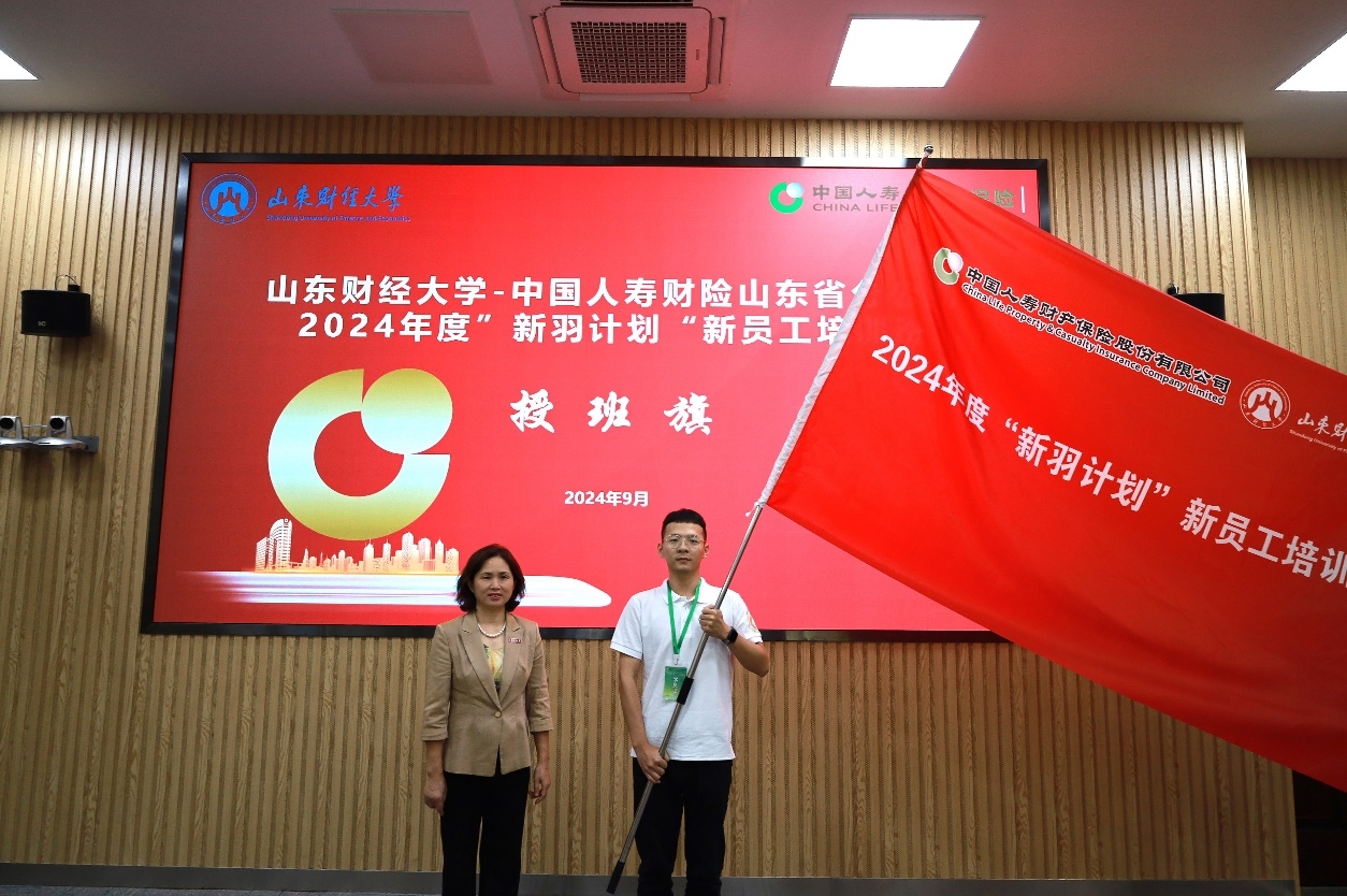 太阳成集团122ccvip党委书记张娟向培训班学员代表授予tyc122cc太阳成集团-中国人寿财险山东省分公司2024年度“新羽计划”新员工培训班班旗。