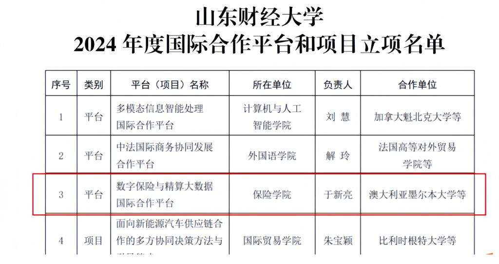 近日,学校发布了《tyc122cc太阳成集团关于公布2024年度国际合作平台和项目立项结果的通知》,经个人申报、学院推荐、学校审核、专家组评审、公示,确定对3个国际合作平台和10个国际合作项目予以立项。我院组织申报的数字保险与精算大数据国际合作平台成功立项,拟与澳大利亚墨尔本大学等单位进行合作建设。
