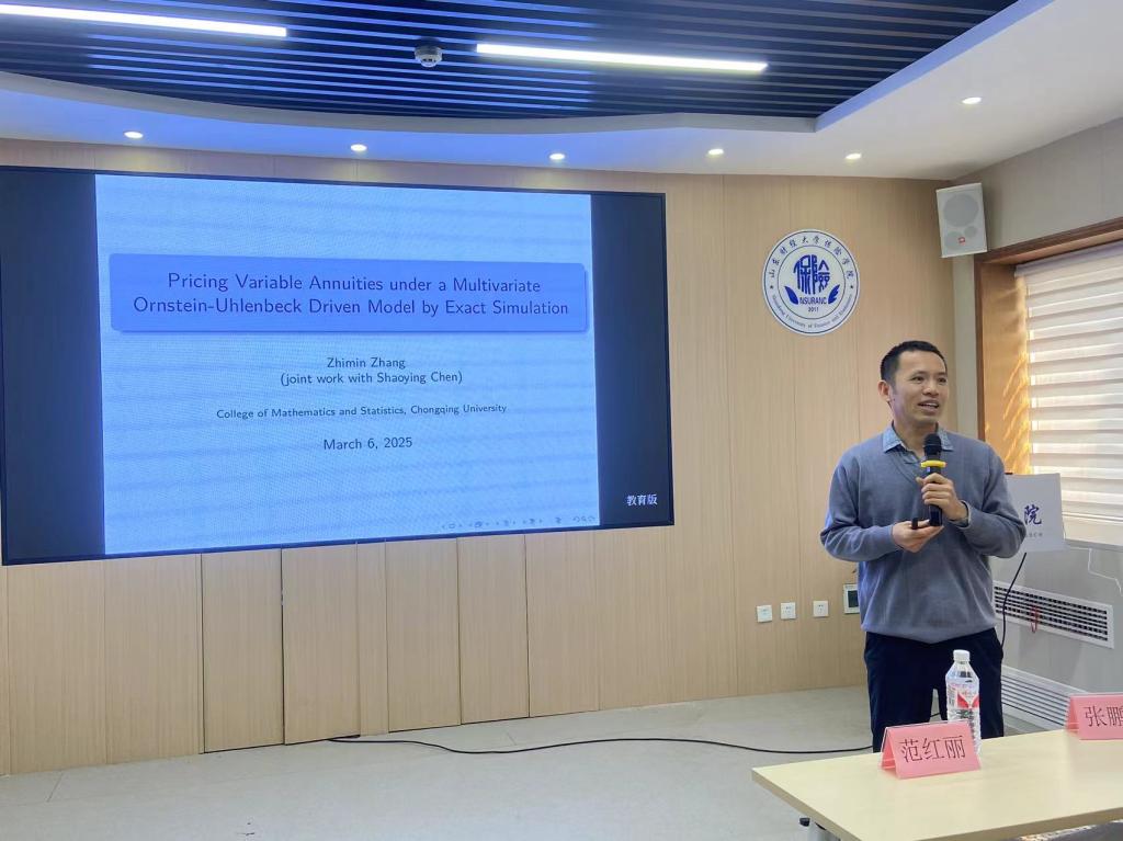 张志民教授带来题为《基于精确模拟的多变量OU驱动模型下可变年金定价》的前沿报告。针对现有研究多局限于单一资产定价的现状,张教授创新性地构建了多元Ornstein-Uhlenbeck驱动的随机波动率模型框架。通过采用Choi(2024)提出的高效模拟方法,实现了多资产可变年金定价的计算优化。他详细讲解了如何通过先期寻找转移分布再进行抽样的技术路径,有效克服传统欧拉方法离散化带来的计算负担,并演示了路径方法在生成市场风险敏感性方面的应用。数值实验结果表明,该模型在保持精度的同时显著提升运算效率,为复杂金融衍生品定价提供了创新解决方案。