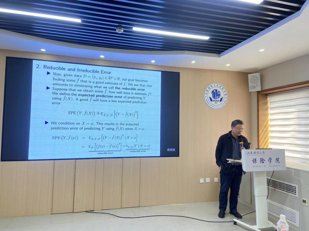 张连增教授以《统计学习中的偏差-方差权衡》为主题展开学术分享。他指出,在精算数据科学快速发展的背景下,统计学习已成为现代精算建模的核心工具。报告聚焦偏差-方差权衡(BVT)这一基础概念,通过理论解析与R软件数值演示相结合的方式,系统阐释了该概念在模型复杂度与泛化能力间的核心作用。张教授从数学推导到可视化呈现层层递进,既剖析了过拟合现象的成因,也演示了正则化技术的应用场景,为师生们掌握精算数据科学关键方法论提供了清晰路径。