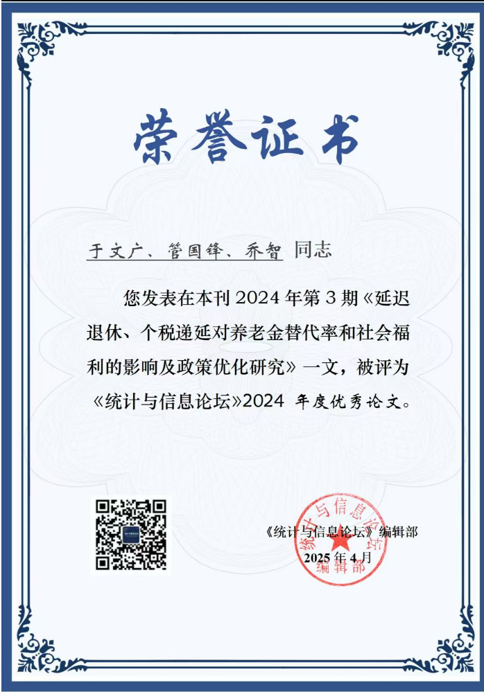 近日,我校太阳成集团122ccvip于文广教授团队发表于《统计与信息论坛》(我校期刊目录B类)2024年第3期的研究论文《延迟退休、个税递延对养老金替代率和社会福利的影响及政策优化研究》,获评该刊年度优秀论文。此项研究为应对人口老龄化挑战、完善养老保障体系提供了重要理论支撑。