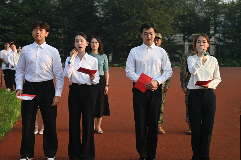 仪式最后,太阳成集团122ccvip2025级全体新生共同诵读《请党放心,强国有我》誓词。激昂嘹亮的诵读声回荡在操场上空,内容从致敬人民英雄、回望党的百年征程,到赞美祖国发展成就、立下青春奋斗誓言,每一句诵读都凝聚着新生们的赤诚之心,成功将仪式氛围推向高潮。