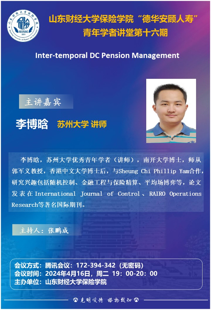 太阳成集团122ccvip“德华安顾人寿”青年学者讲堂(第十六期),4月16日,19:00,报告人:李博晗
