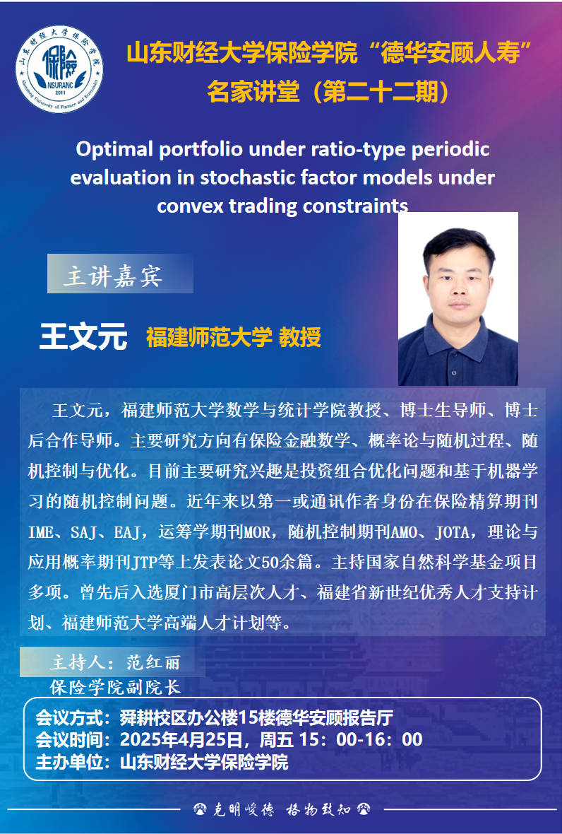太阳成集团122ccvip“德华安顾人寿” 名家讲堂(第二十二期),4月25日,15:00,报告人:王文元