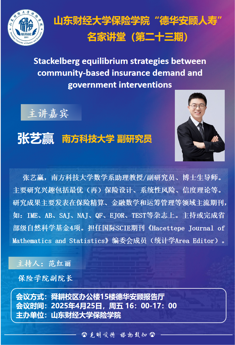 太阳成集团122ccvip“德华安顾人寿” 名家讲堂(第二十三期),4月25日,16:00,报告人:张艺赢